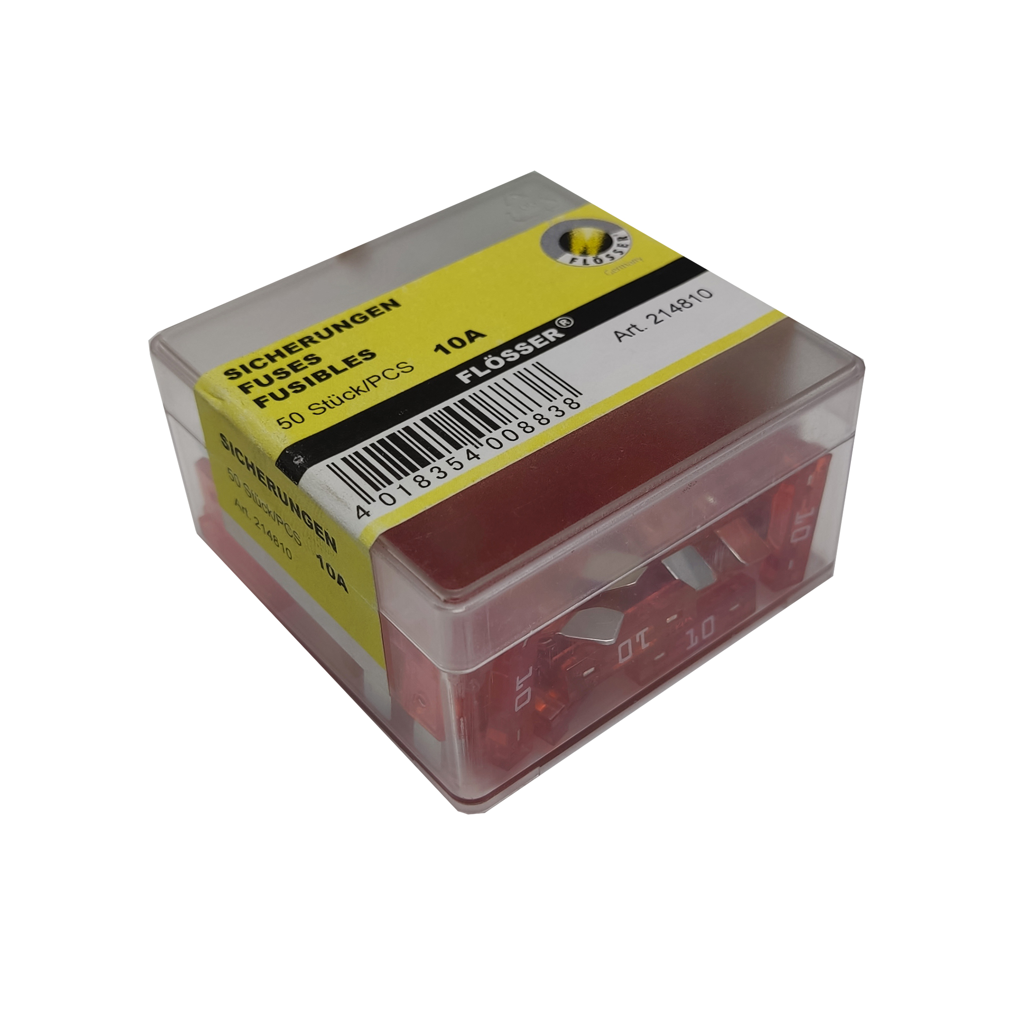 فیوز دو شاخ شیشه ای 10 آمپر آلمانی از برند فلوسر ، برای حفاظت از کابل ها ، اجزای الکتریکی و سیم های خودرو.