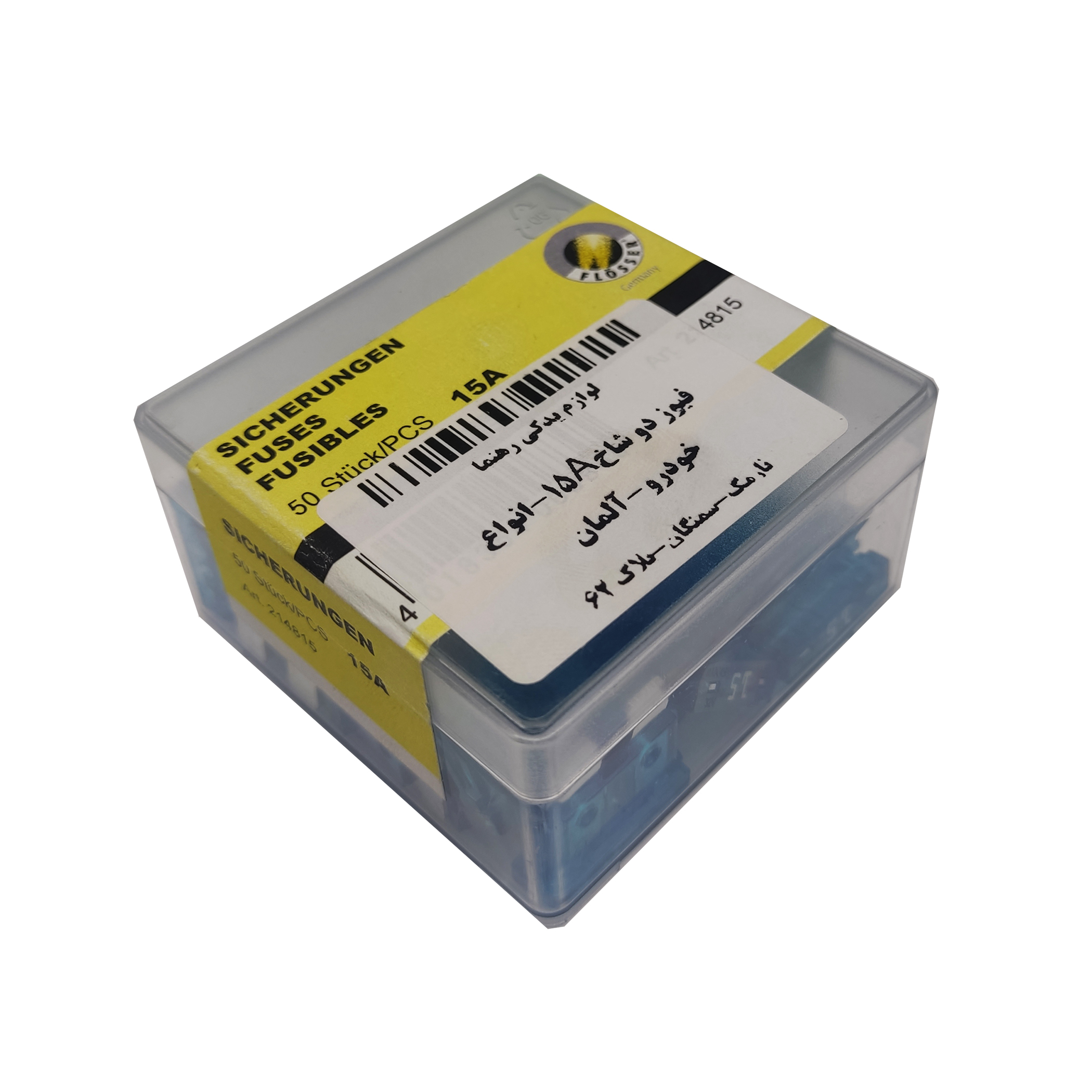فیوز دو شاخ شیشه ای 15 آمپر آلمانی از برند فلوسر ، برای حفاظت از کابل ها ، اجزای الکتریکی و سیم های خودرو.