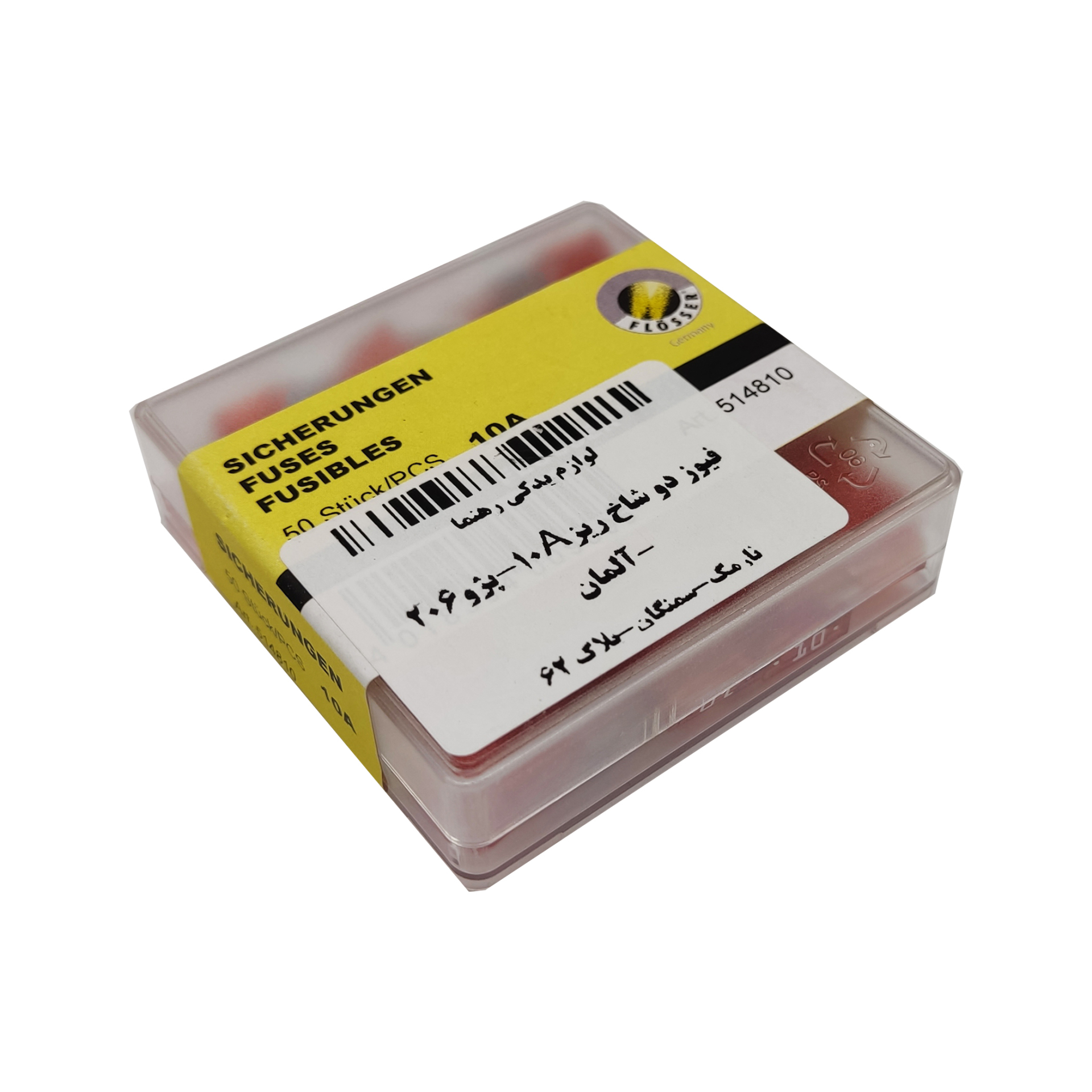 فیوز دو شاخ شیشه ای ریز 10 آمپر آلمانی از برند فلوسر ، برای حفاظت از کابل ها ، اجزای الکتریکی و سیم های خودرو.