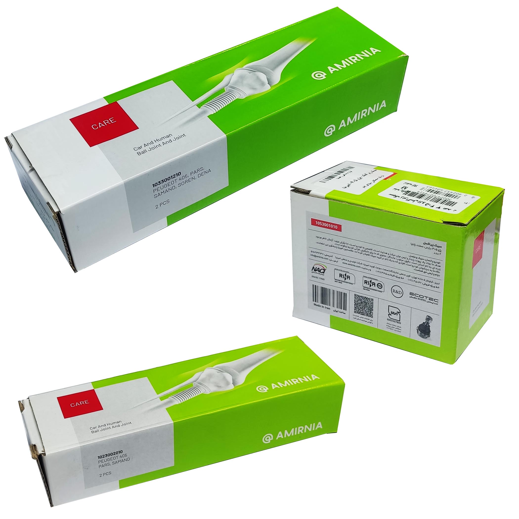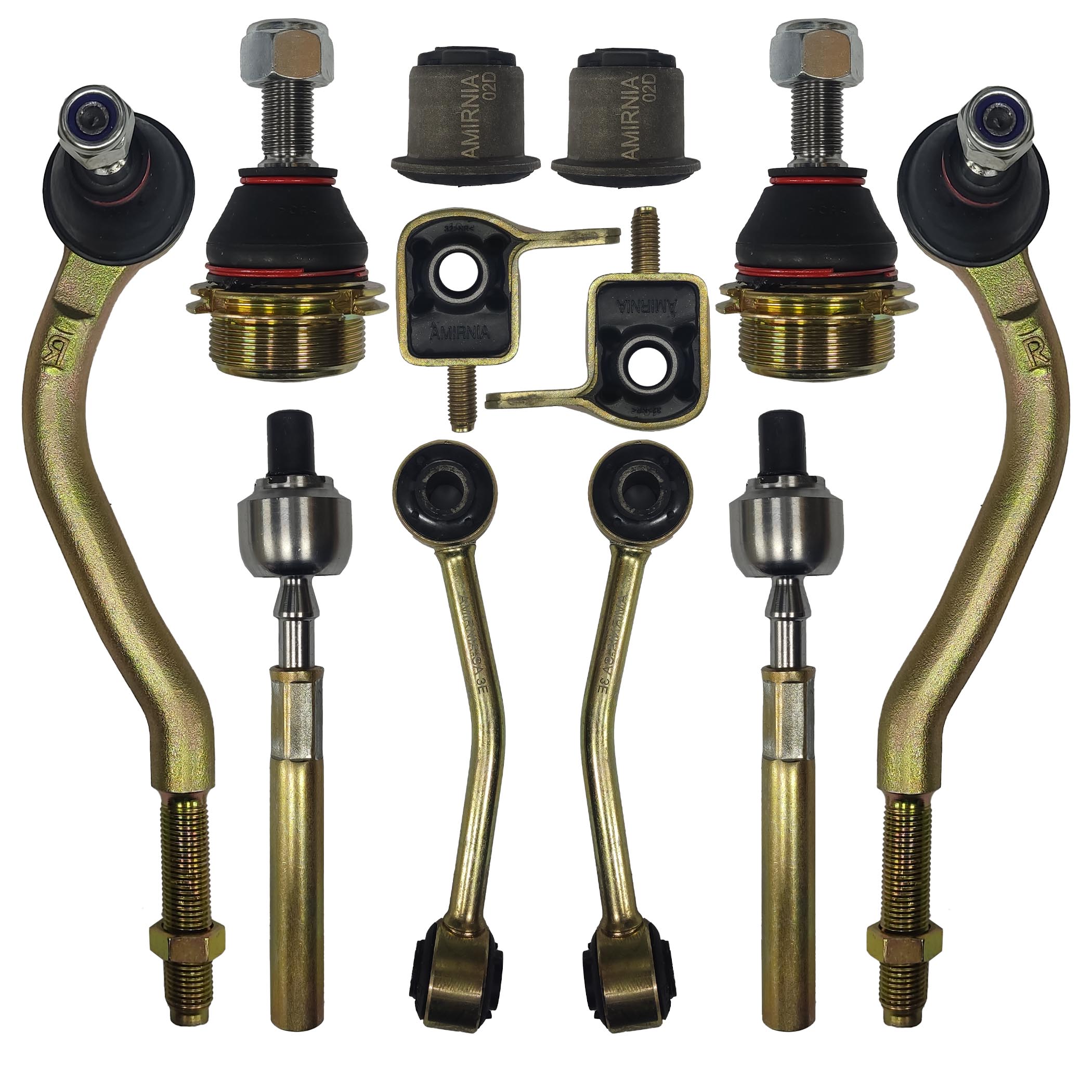 کیت کامل جلوبندی امیرنیا شامل دو عدد سیبک فرمان ، دو عدد میل موج گیر ، سیبک های زیر کمک ، چهار عدد بوش طبق و قرقری های فرمان. مناسب برای تمام مدل های پژو 405 ، پژو پارس ، انواع سمند و دنا معمولی.